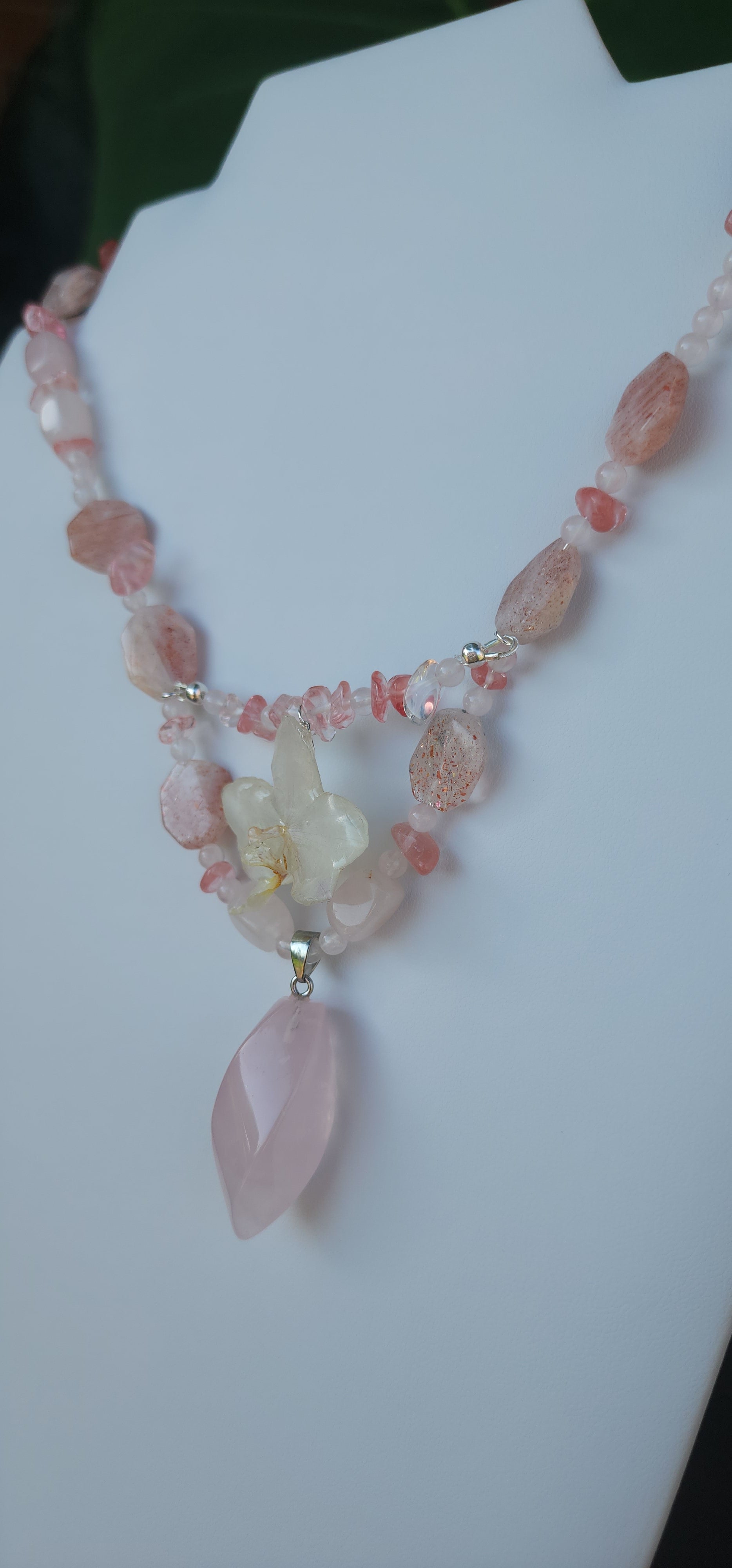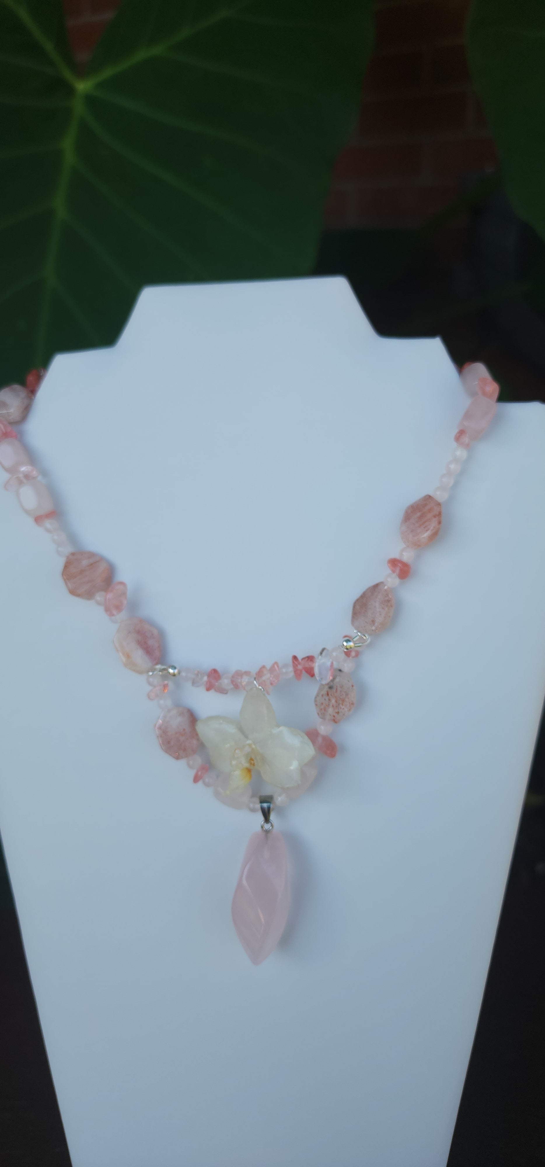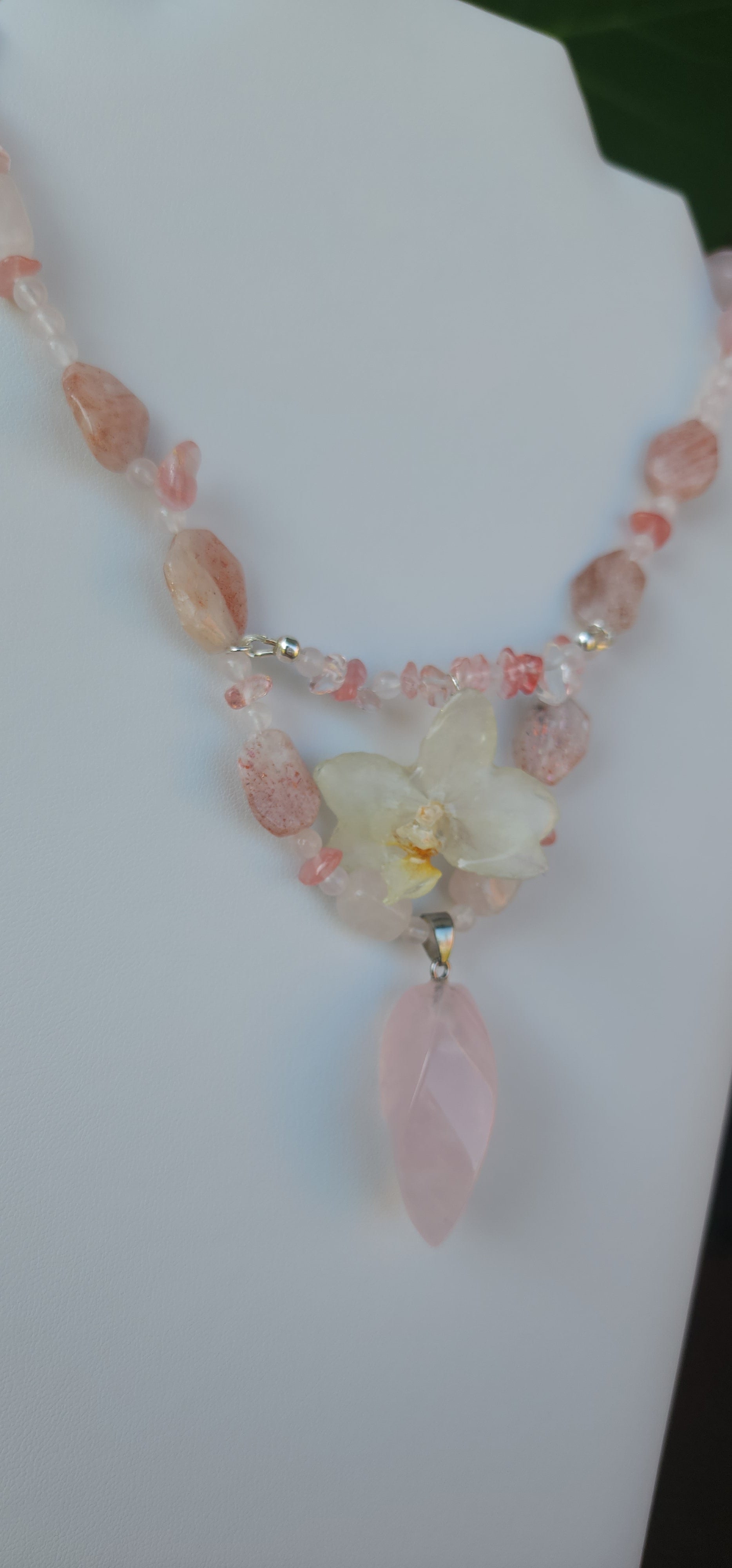 Collar con piedras semipreciosas, con piedras solares, una orquídea lunar, joya en tono plateado.